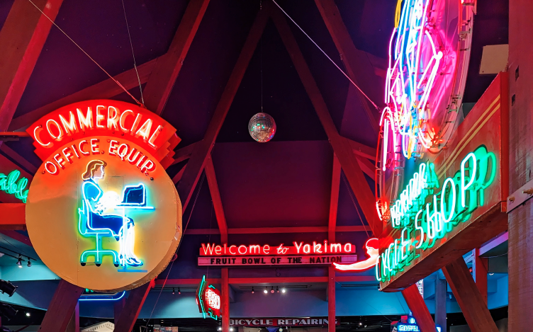 In 1996, the Yakima Valley Museum started collecting neon signs from businesses that were closing or did not want the continued expense of maintaining their neon signs. Dick Elliott’s Circle Squared, a piece of neon artwork, is placed as a dramatic end to the Helen N. Jewett Bassalt Gallery and served as the artistic inspiration for the Museum's current logo.